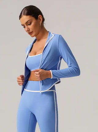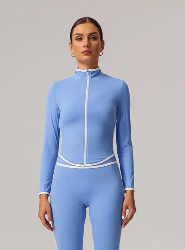 Features a slim-fit full-zip jacket offering a sleek and comfortable fit. Ideal for yoga, workouts, or casual wear, it combines modern design with performance-ready functionality.